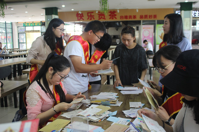 早上九点,志愿者集合完毕后对收集到的积压信件进行整理。将写有明确宿舍号的信件交由志愿者同学送递至收信人宿舍。其他信息模糊的信件则交由同学重新整理,并且通过微博公布或者拨打电话等方式交由收信人。17级自然二班的吕然同学表示:“参加这个活动使得自己更加了解邮递员的工作,也让自己感受到了邮递员坚韧的工作精神。”