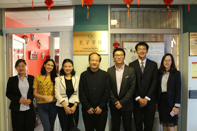 郑文参赞(左四)和丁巧副总领事(左三)到访德班孔院指导工作