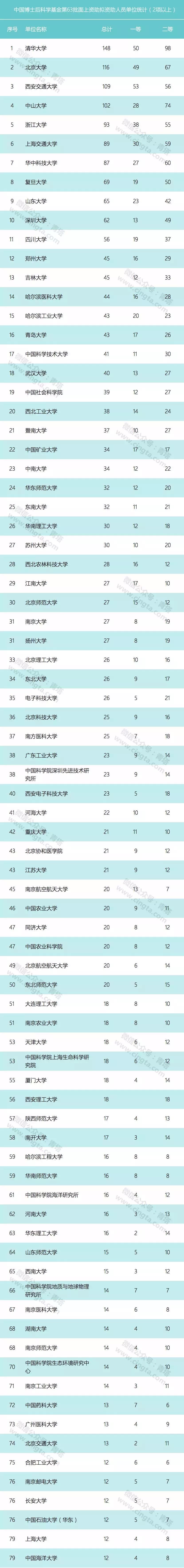 日前,中国博士后科学基金会公示了第63批面上项目资助名单,共有3662个项目(不含军队系统)获得资助,其中一等资助1220项,二等资助2442项(含西部专项50项)。我校共有10个项目入选资助项目,其中一等3人;二等7人。入选资助项目数全国排名第88名。具体情况如下: