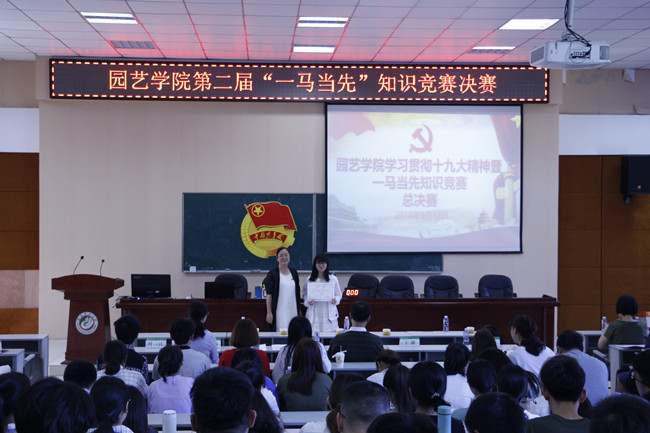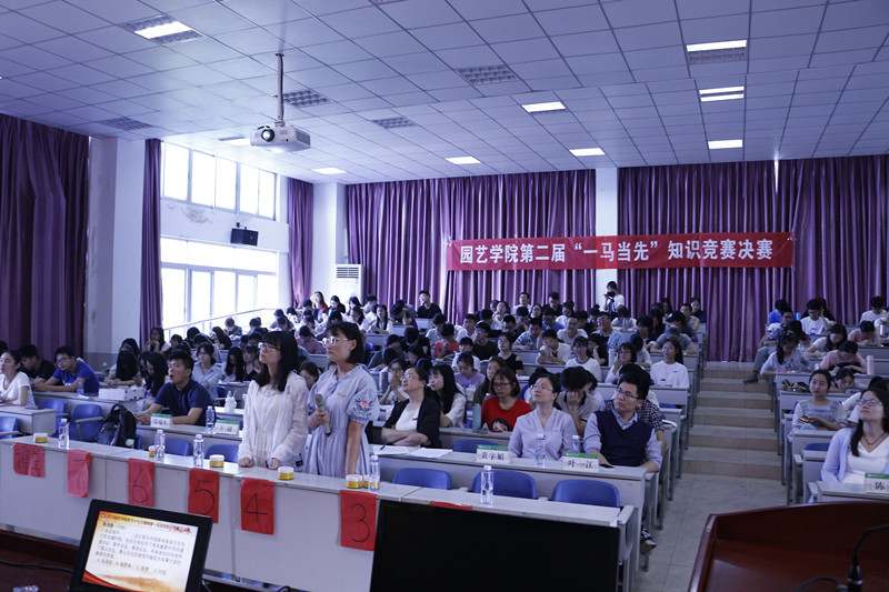 5月12日,为深入学习宣传贯彻习近平新时代中国特色社会主义思想和党的十九大精神,贯彻落实全国和全省高校思想政治工作会议精神,园艺学院在生物楼510教室举办第二届“一马当先”知识竞赛总决赛。院党委书记张华英、副书记张文元、党委秘书黄宇媚、团委书记陈萍,辅导员王捷、叶一江、郑端生出席了大赛并担任评委;2016级本科生党员,2016级、2017级入党积极分子和部分2016级、2017级青年团员共计240人观摩了大赛。