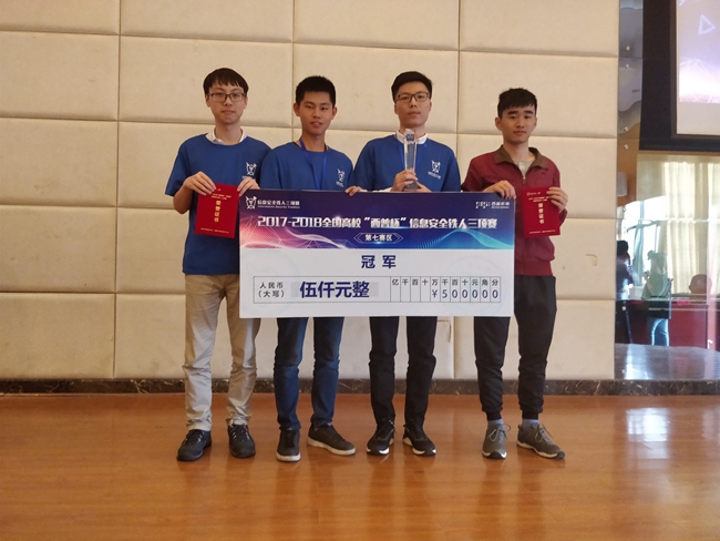 5月11日,2017-2018全国高校“西普杯”信息安全铁人三项赛第七赛区比赛在福州大学旗山校区举行,共有来自厦门大学、福州大学等福建省21所高校的21支代表队参加了比赛,最终角逐出冠、亚、季军各1队。由我校计算机与信息学院2014级网络工程专业的张旭、陈少男、黄文成和2015级的王成敏同学组成的参赛队,经过8个小时持续拼搏,最终,凭借扎实的网络安全知识功底、较强的创新能力和实践动手能力,荣获赛区冠军并晋级全国总决赛。