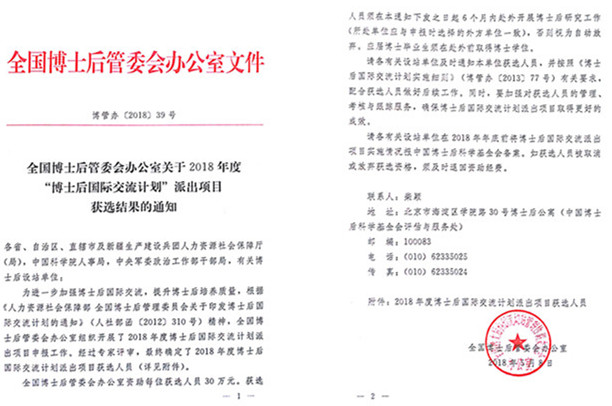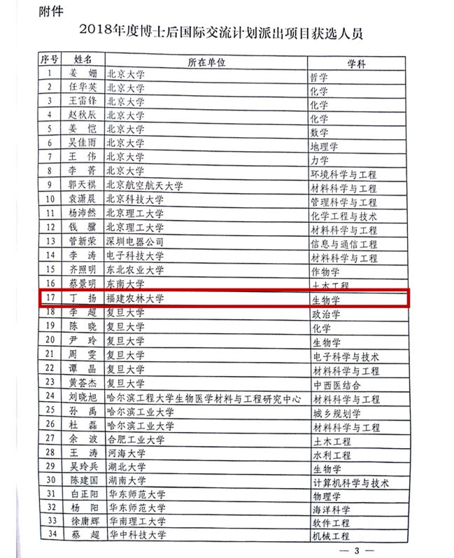 日前,全国博士后管委会办公室下发《全国博士后管委会办公室关于2018年度“博士后国际交流计划”派出项目获选结果的通知》(博管办〔2018〕39号)文件,我校生物学流动站丁扬博士后荣获资助,资助金额30万元,博士后合作导师为陈新华教授。据统计,全国共有120位博士后获得资助,福建省2位博士后获得资助,分别来自我校和厦门大学。
