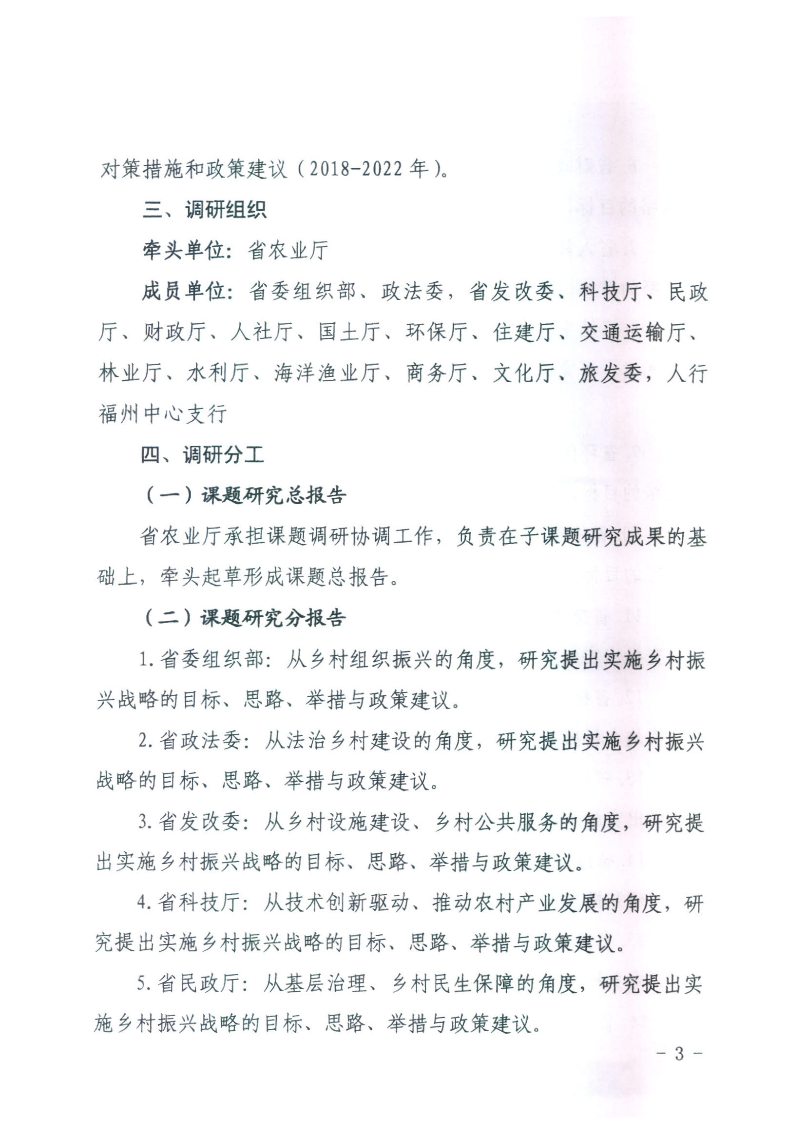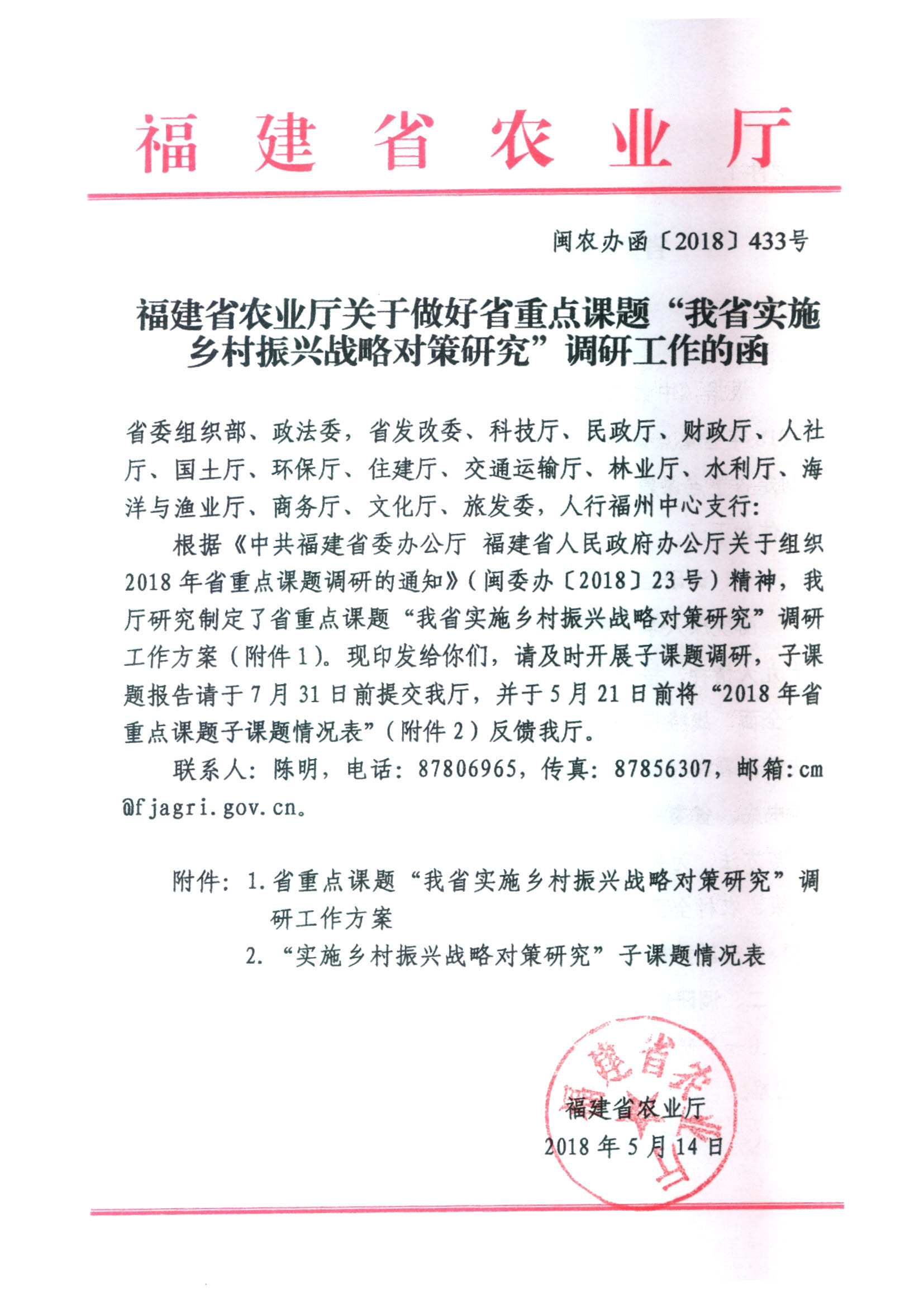 转发福建省农业厅关于做好省重点课题“我省实施乡村振兴战略对策研究”调研工作的函