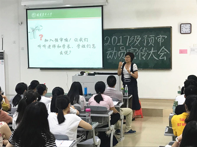 在2017级预审员纳新宣讲动员大会上,老师们分别就预审团成立的目的、意义、发展历程、取得的成就等方面展开宣讲,内容生动丰富,深深的吸引了各位同学。之后由预审团王长江等8位学生代表分别就自己参加预审工作的所学、所思、所得进行了分享和答疑,现场氛围热烈,与会的2017级同学纷纷表示想要加入财务预审团这个大家庭。