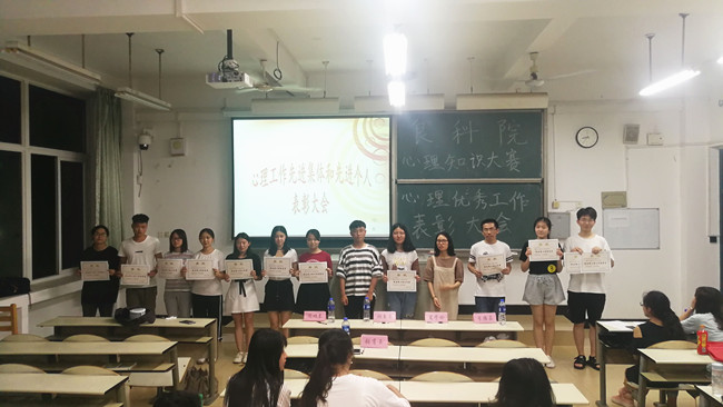 5月27日晚,由食品科学学院心理健康发展部主办的心理知识大赛暨心理工作先进表彰会在创新楼114举办。食科院学生会主席团林玉春、蓝学玲,植物保护学院心理部部长陈功春,食科院心理部长张肖玉等担任评委,17级各班部分学生参与此次活动。