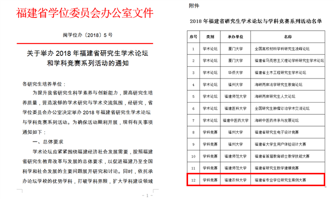 日前,根据福建省学位委员会《关于举办2018年福建省研究生学术论坛和学科竞赛系列活动的通知》(闽学位办〔2018〕5号)的文件精神,为提升研究生科学素养与创新能力,提高研究生培养质量,营造浓郁的学术研究与学术交流氛围,省学位委员会办公室决定举办2018年7场学术论坛与5个学科竞赛,其中,我校承办学科竞赛1个。