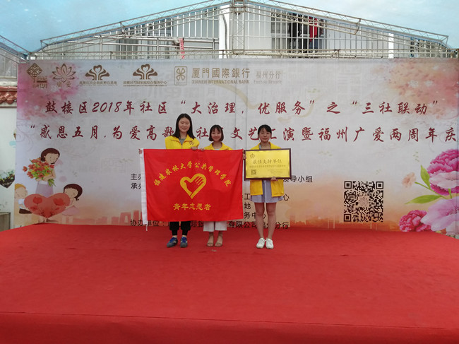 近日,在福州市鼓楼区2018年社区“大治理,优服务”竞赛拉练活动之“三社联动·感恩五月,为爱高歌”感恩月系列活动周年会上,鼓楼区委社区建设工作领导小组对2018年上半年志愿服务进行了总结,同时表彰了志愿服务优秀团体和个人。公共管理学院青年志愿者协会荣获“最佳支持单位”称号。