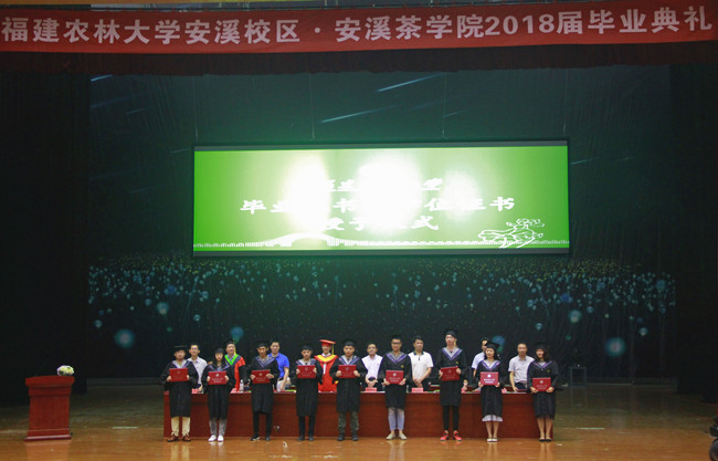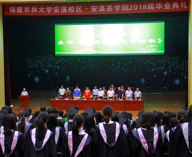 6月1日,安溪校区·安溪茶学院2018届毕业典礼于安溪校区明德报告厅举行。安溪县人民政府副县长丁建铭,安溪茶学院党委书记雷国铨,院长林金科,党委副书记黄成茂、李治洲,副院长孙威江、陈勇、范水生,金山学院党委副书记肖知亮出席典礼。毕业典礼由范水生主持。安溪茶学院各系(部)室负责人,实验中心主任,党支部书记,金山学院教师代表,安溪校区师生代表,家长代表,物业代表及503名安溪茶学院、113名金山学院毕业生参加典礼。