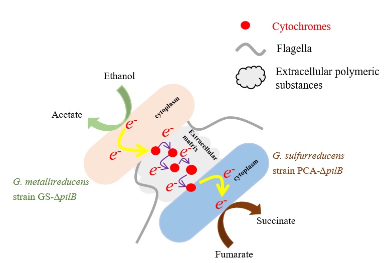 自然环境中的微生物间的代谢协作可以促进微生物适应环境。基于种间电子传递的互营共生关系广泛存在于微生物世界。微生物种间直接电子传递(DIET)是最近发现的一种全新的种间电子传递方式,广泛存在于微生物产甲烷或厌氧甲烷氧化群落中,是地球碳循环的重要引擎。传统的理论认为,DIET主要依靠通过微生物表面生长的导电菌毛来实现种间电子传递。周顺桂团队以模式菌株Geobacter metallireducens和Geobacter sulfurreducens为研究对象,通过抑制菌毛蛋白组装蛋白(PilB)的表达来间接抑制菌毛的表达,同时维持了胞外细胞色素C的表达完整性。基于该突变的共培养实验发现,导电菌毛并不直接参与微生物间的种间直接电子传递,而胞外细胞色素C——Gmet_2896蛋白——对DIET具有重要作用。该研究揭示了胞外细胞色素C单独介导的DIET新途径,为理解微生物种间电子传递提供全新的视角。