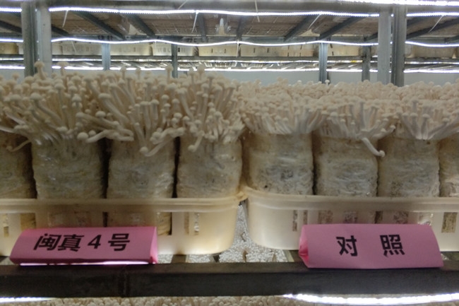 “闽真4号”原基形成快,菇蕾均匀而且密度大;菌盖呈扁半球形,表面光滑,浅黄色;菌柄细长,菌肉厚实,呈白色;与对照菌株白玉菇除了颜色上(白玉菇呈白色)外形基本相同,但出菇更为整齐、均匀一致,且有效菇朵数较多,商品性状优良。“闽真4号”出菇周期比白玉菇(对照)提前3-5天,成品菇(采收期为26d)单袋平均产量为400g/袋,成品率为89.61%;白玉菇(采收期为30 d)成品菇平均单袋386.67g/袋,成品率为84.42%;较对照组成品率提高5.19%。据悉,真姬菇作为我省特色食用菌工厂化品种,下一步将在福建省内进行大面积推广,切实推进食用菌产业提质增效,进一步助力乡村振兴。