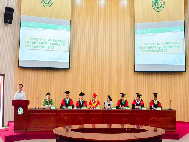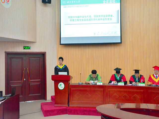 典礼上,陈立松宣读了《开云网页版资源与环境学院关于表彰2018届优秀毕业生的决定》。主席台上的领导为学院2018届优秀毕业生颁发了荣誉证书。国土资源系宋羽老师代表全体教师对全体毕业生表达祝贺,希望毕业生们不忘初心,砥砺前行,坚持不懈,与时俱进,心存高远、勇于担当,乐于奉献,传递正能量。原学院学生会主席、2017年度国家奖学金获得者、2014级环境工程专业温进涵同学代表全体毕业生发言,他回首了成长的四年,向学院领导老师们的辛勤付出表示感谢,并与所有毕业生自勉,带着理想与信心再启程,去迎接新的机遇与挑战。毕业生家长代表杨永松同志表达了对学校及学院的感激之情以及对在校生和学院的祝福。在校生代表洪娜娜同学表达了对学长学姐的感激和不舍,表示学弟学妹们定会继续发扬资环人奋勇争先,勤学创新的精神。