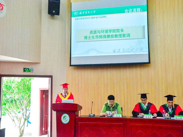 6月12日上午,资源与环境学院2018届毕业生毕业典礼在博学报告厅举行。学院党委副书记(主持工作)陈月霄、院长周顺桂、党委副书记刘强、副院长陈立松、副院长范胜龙、副院长张黎明,各系教师、辅导员、班主任、毕业生家长代表以及2018届全体毕业生参加了此次毕业典礼。典礼由刘强主持。