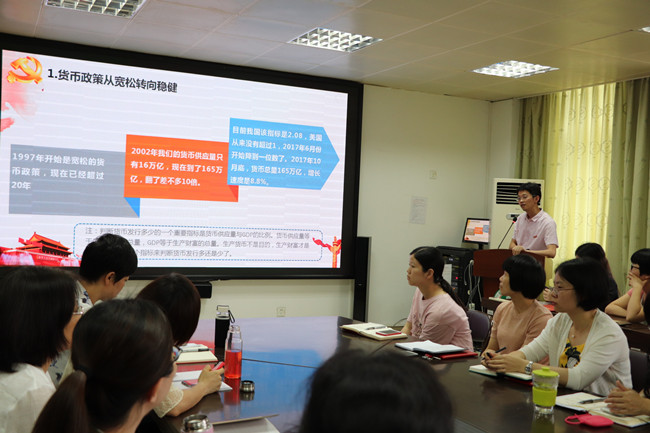 黄振胜从习近平新时代中国特色社会主义思想对金融领域提出的“健全货币政策与宏观审慎政策的双支柱调控框架”的根本要求入手,分为“货币政策与宏观审慎政策双支柱调控框架内容解读”、“我校财务基本情况”、“强化双一流大学建设资金保障的措施建议”三个部分,将学习十九大精神的体会与全体党员同志做了交流。他指出在当前货币政策转向稳健、宏观审慎政策倒逼逆周期调控的背景下,面对我校资金需求持续旺盛的现状,全体财务人员尤其是全体党员财务工作者应齐心协力着重做好积极拓宽财源渠道、优化支出结构、加强预算管理等方面的工作,为我校“双一流”建设做好资金保障和财务服务工作。
