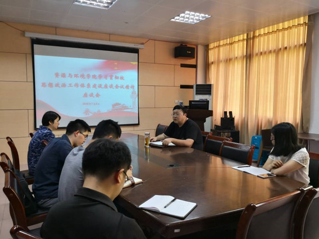 7月4日上午,资源与环境学院在博学楼210室召开会议,学习传达校思想政治工作体系建设座谈会精神,学院团委书记、辅导员、班主任代表参会,会议由院党委副书记刘强主持。