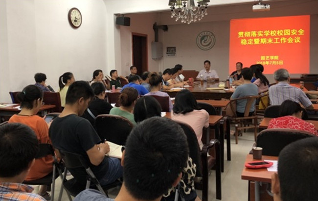 7月5日下午,园艺学院在一楼会议室召开全体教职工大会,传达贯彻学校校园安全稳定暨期末工作会议精神,结合学院工作实际进行部署。会议由学院副院长曾黎辉主持。