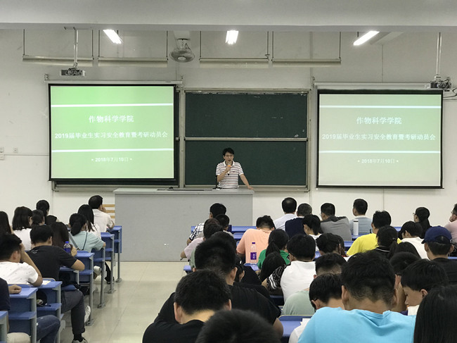 7月10日上午,作物科学学院在禧强楼106召开2019届毕业生毕业实习安全培训会暨考研动员会。学院党委书记童庆满、院长曾任森、党委副书记郑龙章、各系主任、副主任、实习指导老师和毕业班辅导员参加了会议。