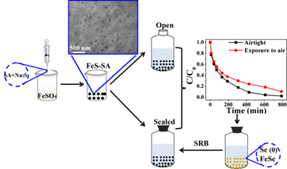 硫化亚铁(FeS)纳米颗粒由于其出色的还原能力被广泛的用于污染物去除。然而,FeS易团聚和易氧化的特性会使其还原能力大打折扣。曾建雄团队采用海藻酸钠原位固定化技术,制备了FeS-海藻酸钠稳定化的纳米复合物,并选取一种典型污染物,亚硒酸盐(Se(IV)),研究FeS-海藻酸钠纳米复合物对Se(IV)的去除作用。实验发现,带负电的海藻酸钠附着在FeS周围,使得FeS由于静电排斥而减少团聚,因此改善FeS的还原活性,提高了Se(IV)的去除效率。而且,海藻酸钠的包埋作用,影响溶液中的溶解氧的扩散,降低FeS被溶解氧氧化的机会。通过X射线光电子能谱的表征和电子平衡计算,Se(IV)主要被还原为毒性较低的Se(0)和Se(-II),而FeS则被氧化为针铁矿(α-FeOOH)和单质硫(S8)。同时,为了提高FeS-海藻酸钠的可重复利用性,本研究采用自然界中的广泛存在的硫酸盐还原菌(SRB)生物原位还原被氧化的FeS。SRB通过生物代谢作用,将硫酸盐还原为负二价的硫(S(-II)),S(-II)则将FeS的氧化产物α-FeOOH再还原为FeS,这种生物法制得的FeS-海藻酸钠复合物能够重复利用5个循环以上。该研究展示了FeS-海藻酸钠在污染物修复中的出色能力,为解决环境污染提供了一种新的方法。