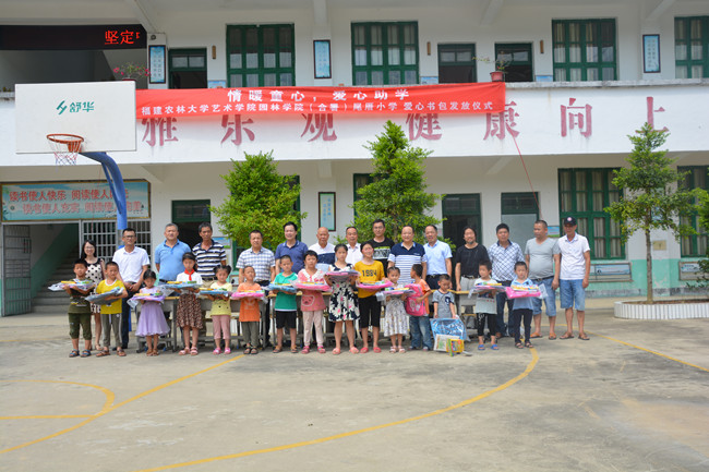 最后,学院师生为尾厝小学学生赠送书包、画笔、绘画本等学习用品。