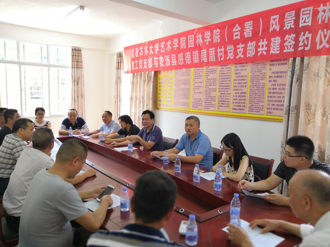 座谈会后,学院风景园林系教工党支部与尾厝村党支部签订了支部共建协议。学院领导、师生及感德镇领导、尾厝村干部共同为学院城乡规划系来村开展规划设计调研的暑期三下乡社会实践队开启实践启动仪式。