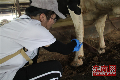 为了掌握牛体各部位生长发育状况,以及各部位之间相对发育关系,队员们还对其中三头牛进行体尺测量。牛的体尺表示的是牛各部位长度、宽度、角度、容积的大小,它能够反映个体或牛群的外貌结构特点。从工作人员的操作中,实践队员获悉操作手法和注意事项,例如后肢最高点突出的地方是腰角;量胸围的时候需要有一个能放进两指的空隙,以便上下随意拉动;而腕围则是通过测量肢体最细的部位所获得。测定项目包括体高、体直长、体斜长、胸围、腰高、腰宽等。在测量过程中,队员们熟悉了奶牛的身体结构,同时联系上课堂所学的理论知识,对奶牛个体有了一个完整的认识。