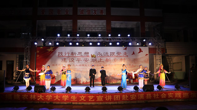 传播新思想,建设FAFU-YOUTH新时代农村讲习所。组织大学生骨干培训班和学生理论社团学员,广泛开展小规模、互动式、有特色、接地气的面对面宣讲交流,积极宣传解读习近平新时代中国特色社会主义思想和党的十九大精神。开展文艺巡演,通过配乐诗朗诵《走进梁家河》、合唱《不忘初心》、舞蹈《民族大联欢》、民乐合奏、情景剧等,让习近平新时代中国特色社会主义思想和党的十九大精神深入人心。“向往你的向往,幸福你的幸福,不忘初心,继续前行,万水千山最美中国道路”,《不忘初心》唱出了人民群众不忘初心,沿着中国特色社会主义道路继续前进的决心。