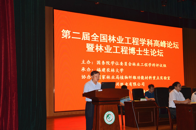 8月10日至12日,由国务院学位委员会林业工程学科评议组主办,我校承办,国家林业局植物纤维功能材料重点实验室和福建省恒兴纸业有限公司协办的第二届全国林业工程学科高峰论坛暨林业工程博士生论坛在福州举行。中国工程院院士李坚、蒋剑春,国务院学位委员会林业工程学科评议组召集人中国林科院副院长储富祥、南京林业大学化工学院院长王飞,我校校长兰思仁,副校长郑郁善,福建省教育厅高教处、中国林业科学研究院木材工业研究所及林产化学工业研究所负责人,中南林业科技大学、西南林业大学、北华大学副校长等领导和来自全国农林高校、科研院所等26个单位的100多位代表出席论坛。