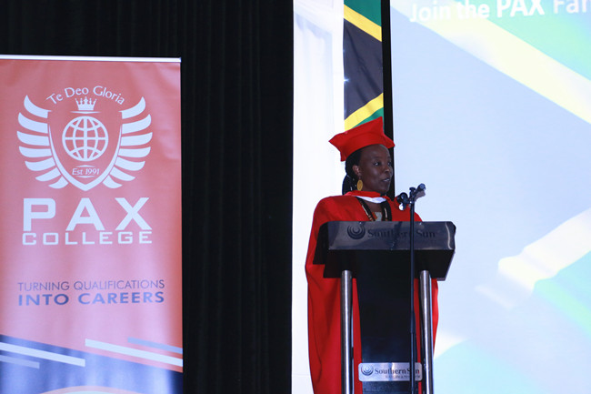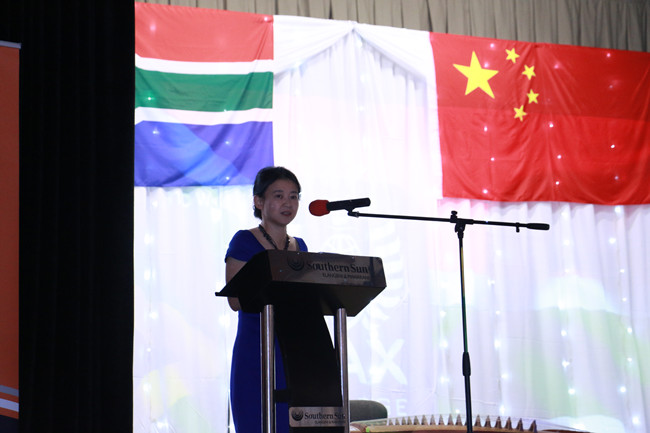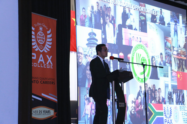 毕业典礼现场挂上了中国国旗与南非国旗,现场热闹非凡。典礼伊始,派克斯学院执行董事长布伦达·贾文德(Brenda Govender)致欢迎词,并为大家介绍了派克斯学院的基本情况、发展历史和典礼的节目安排。