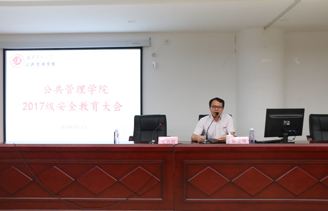 为提高公共管理学院学生安全防范意识,9月4日晚,公共管理学院在公管楼201会议室召开了新学期安全教育大会。学院党委副书记陈建辉、辅导员、主席团成员及2017级全体本科生参加了会议。