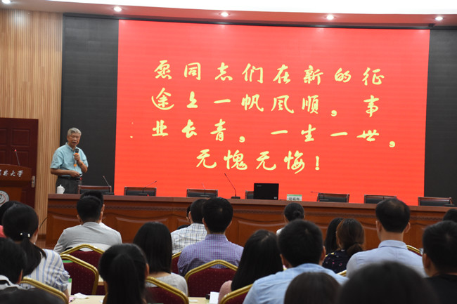 开班仪式后,中国科学院院士谢联辉作《当老师,您准备好了吗?》专题讲座。谢联辉院士结合自身60多年的教学、科研、社会服务经历与新教师畅谈在教学中如何提升自我和理性育才等问题。他认为,青年教师身兼“成才”和“育才”双重任务,提出“认(认准)、爱(博爱)、诚(诚信)、敬(敬业)、五(五种思维、五大素质)、龙(英龙)”六字要诀,激励新教师以敬业、爱国、至诚、为民的精神,专事教学、科研、社会服务,以科学和技术创新为先导推动教育创新,为学科、学校争创一流增添新的活力,培育英龙人才。