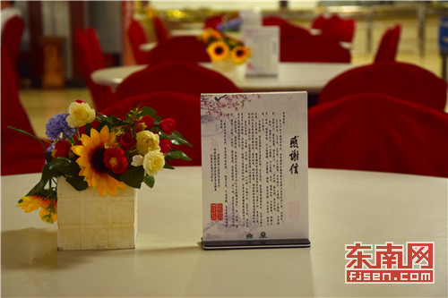 等待老师们入座就餐后,穿着农林大吉祥物“小农”和“小林”公仔的学生为他们送上印有祝福语的定制饮料。早早便“藏匿”在人群中的同学们走上舞台,表演合唱《最美的太阳》。此前,校主要教学区还出现了文言文版“教师节感谢信”的身影,“先生不懈于内,忘身于外。皆因众先生无私之功,方育今之坚毅果敢农林学子,方筑今之欣欣向荣农林大学……”来自林学院的吴仁烨老师再次看到餐桌上摆放的感谢信桌牌后感慨道:“农林大的学子不仅优秀,更时刻怀着感恩之心,甚是欣慰。我也会尽自己所能,教书育人,为国为校培养栋梁之材。”