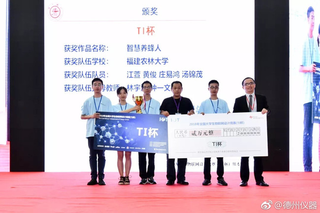 9月15日至16日,2018年TI杯全国大学生物联网设计竞赛全国总决赛于无锡太湖国际博览中心举行。我校学生团队作品智慧养蜂人在激烈的十二强争霸赛中脱颖而出,斩获最高奖项“TI杯”及一等奖。该学生团队由蜂学学院江萱,计算机与信息学院黄俊、庄易鸿,交通与土木工程学院汤锦茂等4位同学组成(指导教师:林宇洪、钟一文)。该获奖作品借鉴工业4.0无人工厂的想法,运用物联网科技实现了蜂场生产的自动化控制,应用北斗技术实现对放蜂轨迹的追踪,应用AR技术实现蜂产品质量溯源,打造无人蜂场的全新概念,得到竞赛评委的广泛认可。