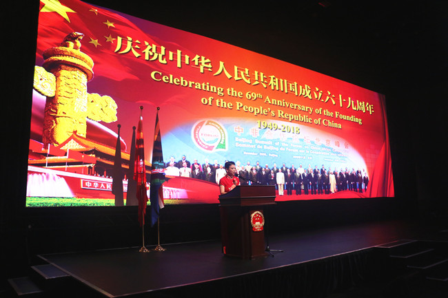 招待会在中南两国国歌声中开始。丁巧代总领事在致辞中首先回顾了过去一年中国各方面建设取得的新成就,以习近平同志为核心的新的中央领导集体,为国家发展规划了新的蓝图,标志着中国特色社会主义进入新的历史阶段。她还表示今年是中南建交20周年,在双方共同努力下,通过中非合作论坛、金砖合作机制、“一带一路”建设倡议三大合作平台,不断深化双边关系,给中南两国人民带来了实实在在的利益。