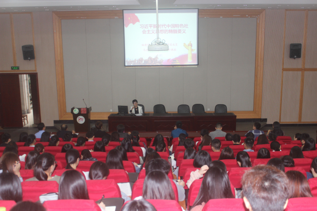10月11日下午,管理学院党委举行习近平新时代中国特色社会主义思想“大宣讲”报告会,邀请校党委新思想专题宣讲团成员、马克思主义学院院长刘新玲教授作题为“习近平新时代中国特色社会主义思想的精髓要义”的辅导报告,报告会由学院党委书记谢志鸣主持,党员师生近200人参加了报告会。
