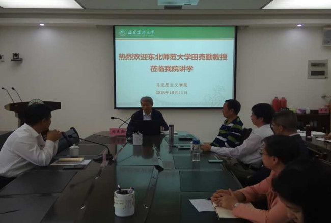 10月11日下午,中央“马工程”专家、东北师范大学田克勤教授在明德楼613会议室做“中国特色社会主义进入新时代的几点认识和思考”的专题报告。马克思主义学院院长刘新玲、院党委副书记(主持工作)连文以及学院全体师生参加此次报告会,报告会由连文主持。