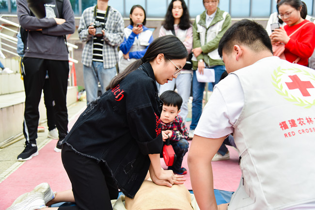 本次活动邀请到中国红十字(福建省)水上救援队为校大学生开设户外课堂,课堂活动内容包括救溺五招“叫叫伸抛划”、自救技能以及心肺复苏及其他紧急处理。岸上水下,救援队队长魏勇生老师与团队队员相互配合为在场的同学示范讲解水上救护知识,生动有趣的讲解将课堂气氛推向了高潮。随后,省水上救援队的老师们下水扮演落水者,同学扮演施救者,亲身实践施救过程。悉知,共有300余人参与此次水上救护培训活动。