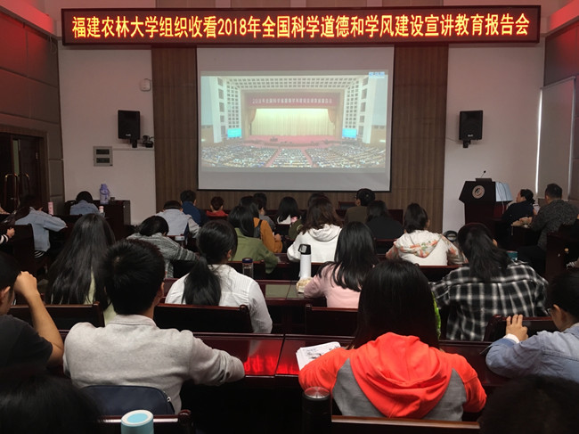 10月15日下午,我校组织研究生、本科生和研究生导师共计70余人在明德楼龙岩厅集中收看2018年全国科学道德和学风建设宣讲报告会直播,其他师生自行收看。