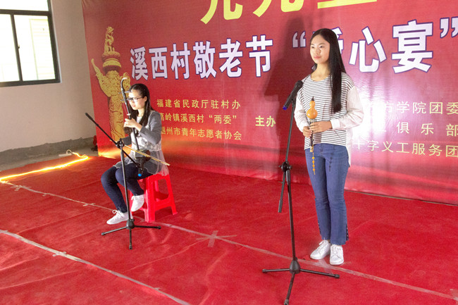 重阳前夕,我校东方学院青年志愿者服务队在永泰县溪西村举办了以“天意怜幽草,溪西重晚情”为主题的重阳节敬老爱老义演活动,为西溪村数十位六十周岁以上的老人带去精彩的文艺演出,他们用实际行动送上暖暖的敬意。