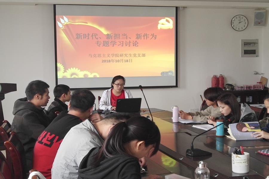 10月18日下午,马克思主义学院研究生第一、第二党支部在明德楼613会议室召开“新时代,新担当,新作为”的专题讨论学习会。会议由研究生第一学生党支部书记张白看主持。学院全体学生参加会议。