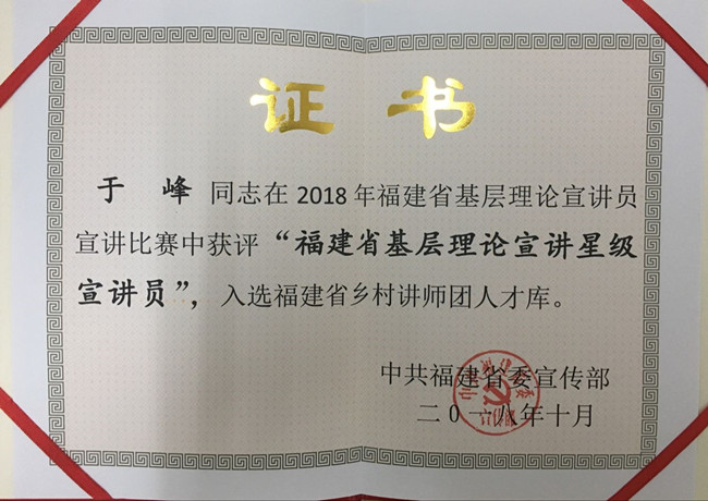 10月17日,由福建省委宣传部主办的全省基层理论宣讲员宣讲比赛决赛在省广播影视集团演播厅举行。我校于峰老师参赛并获评福建省基层理论宣讲“星级宣讲员”,入选福建省乡村讲师团人才库。