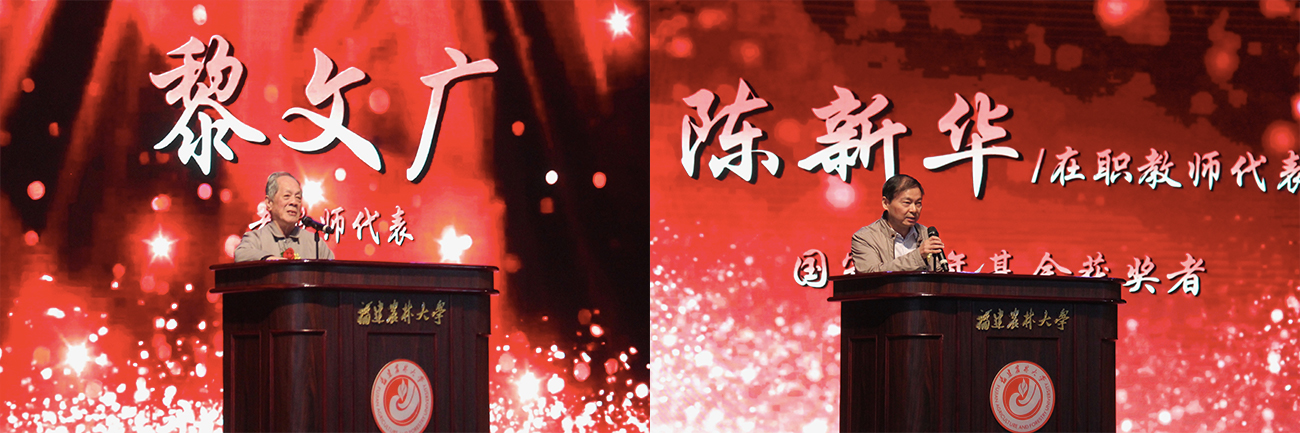 老教师代表黎广文,在职教师、国家杰出青年基金获得者陈新华教授分别致辞