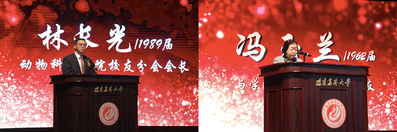 动物科学学院校友分会会长林长光,学院58级校友冯玉兰分别致辞