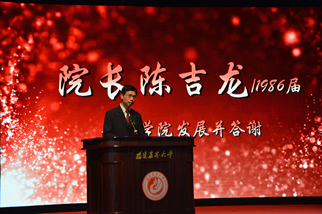 院长陈吉龙总结发言,他向前来参加庆典的领导和校友们表示由衷的感谢,并详细介绍了学院的学科发展情况,表示学院将遵循高等教育发展规律与社会发展需求,紧紧围绕人才培养的根本任务,以科学研究和学科建设为龙头,以提高质量和核心队伍建设为关键,以服务社会为使命,为学院更美好的未来而不懈奋斗。