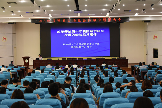 10月24日上午,福建师范大学产业经济研究中心主任、博士生导师郭铁民教授做客我校金山讲坛,在禧强楼学术报告厅为我校师生做了一场题为《改革开放四十年我国经济社会发展的经验及其规律》的讲座,吸引了300多名师生前来聆听。报告会由宣传部副部长吴有平主持。