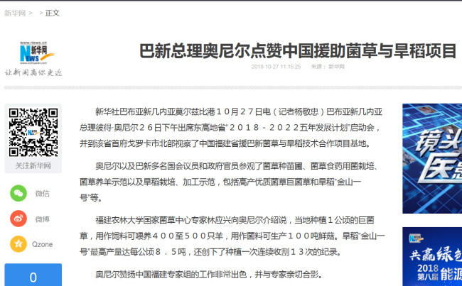 1997年5月,福建省与东高地省签署建立友好省备忘录和菌草技术示范合作协议。当年7月,开云网页版派专家赴巴新实施合作项目。2000年5月,东高地省省长应邀访问福建,双方签署了建立友好省协议书和《福建省援助东高地省发展菌草、旱稻生产技术项目协议书》。
