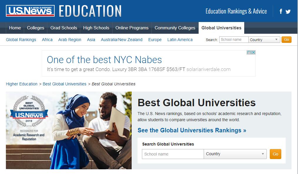USNews世界大学排名是公认的四大较为权威的世界大学排名之一。2019年主要评价指标如下:全球研究声誉12.5%,地区性研究声誉 12.5%,发表论文10%,出版书籍2.5%,学术会议2.5%,标准化引用影响10%,总被引用次数7.5%,高频被引文献数量(在引用最多文献的前10%) 12.5%,高频被引文献百分比(在引用最多文献的前10%)10%,国际合作10%,高频被引文献数量(在各自领域被引次数最多的前1%)5%和高频被引文献百分比(在各自领域被引次数最多的前1%)5%。