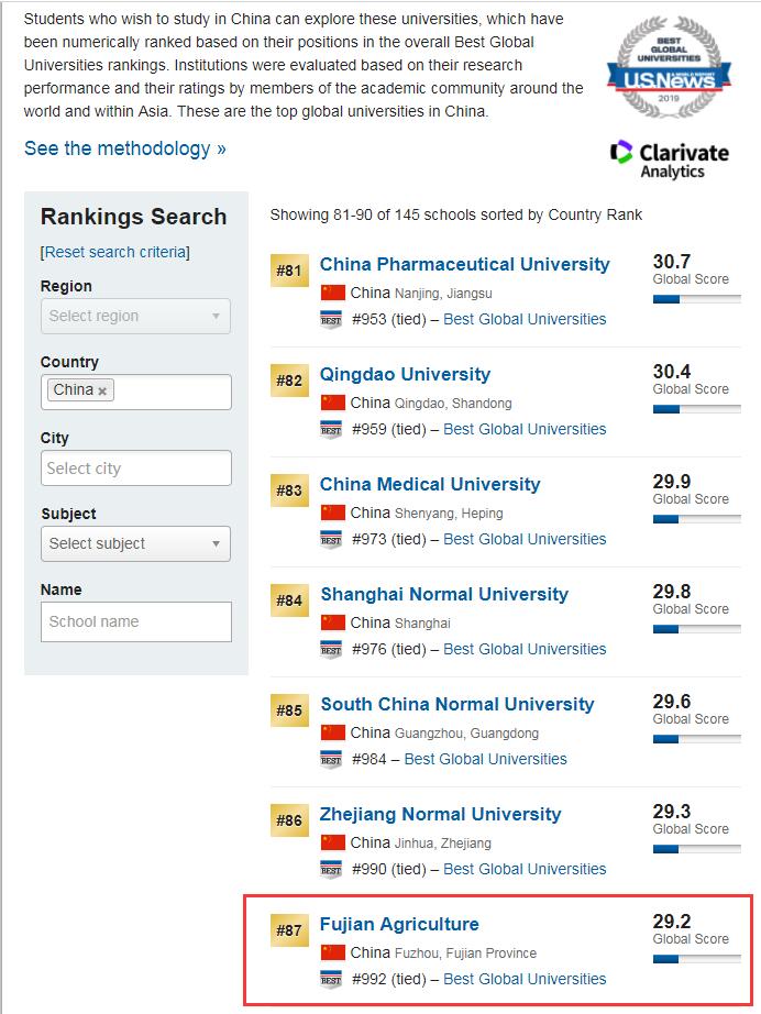 10月30日,USNews(《美国新闻与世界报道》)发布2019世界大学排行榜,我校居全球第992名、亚洲高校第252名、中国内地高校第87名。国内有10所农林高校进入排行榜,我校居第6名。福建省有3所高校进入排行榜(厦门大学、福州大学、开云网页版)。在学科排名中,我校2个学科领域进入榜单,其中农业科学首次进入榜单,居全球第157名;植物与动物科学居全球第313名。