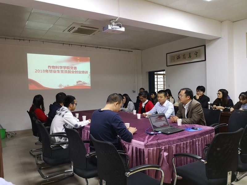 为促进毕业生党员就业创业,提高毕业生党员就业创业能力,作物科学学院党委于11月2日在作物楼3楼小会议室召开了就业创业培训交流会。本次会议由院党委秘书主持,学院党委副书记郑龙章、研究生辅导员、学校就业指导中心黄瑞章老师、学院研究生会所有学生干部及部分2019届毕业生党员出席会议。