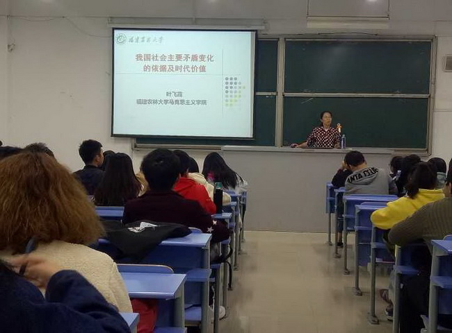 叶飞霞教授以“我国社会主要矛盾变化的依据及时代价值”为主题展开授课。叶飞霞教授讲课生动,既旁征博引又深入浅出,用丰富的实例和大量的数据向大家分析了我国社会主要矛盾的变化依据,其间讲到中国桥、中国港,特别是中国的港珠澳大桥是目前世界上最长的跨海大桥以及中国的上海洋山港将会是全球规模最大、最先进的全自动化码头时,大家都非常的震撼和自豪。