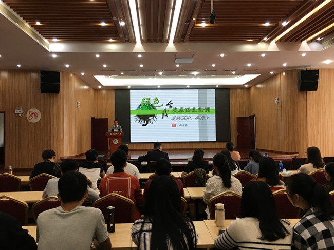 卓立筑教授结合自身工作实际,谈了对GDP的理解与认识,并从其中的优势与不足,引出绿色发展的重要性。他强调既不能忽视GDP,又不能过于倚重,更不能片面追求高成本、高耗能、高污染、非循环的GDP。他指出要把推动形成绿色发展方式和生活方式摆在更加突出的位置,要建立以源头保护制度、损害赔偿制度、责任追究制度、环境治理和生态恢复制度为本的生态文明制度体系。他通过生动的案例阐释了经济发展与GDP以及执行力的关系。最后,他勉励同学们好好学习,将绿色发展理念牢记于心,为经济社会的发展做出更“绿色”的贡献。