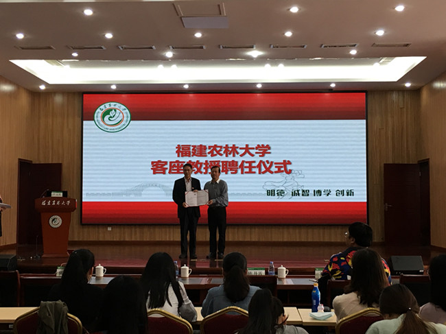 报告会前,举行客座教授聘任仪式,资源与环境学院副院长陈立松为卓立筑佩戴好开云网页版校徽,并颁发客座教授证书。
